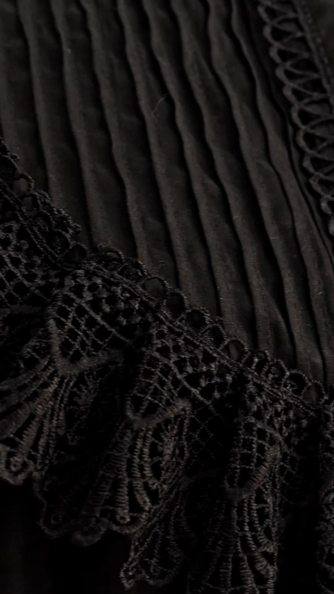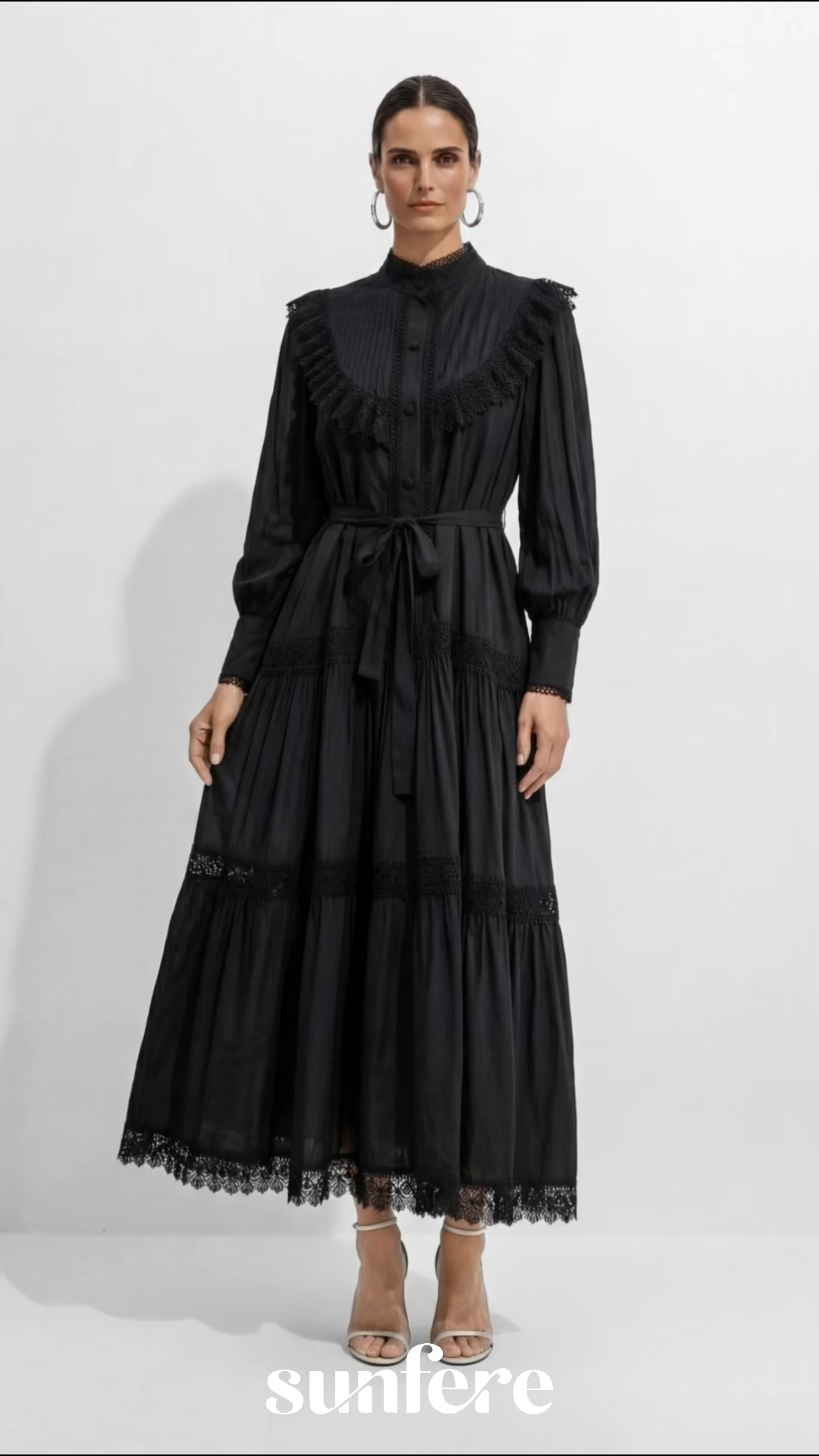 This elegant black lace trim maxi dress, with a stand collar and long sleeves, is perfect for garden weddings, brunch dates and casual events, exuding vintage romantic charm.