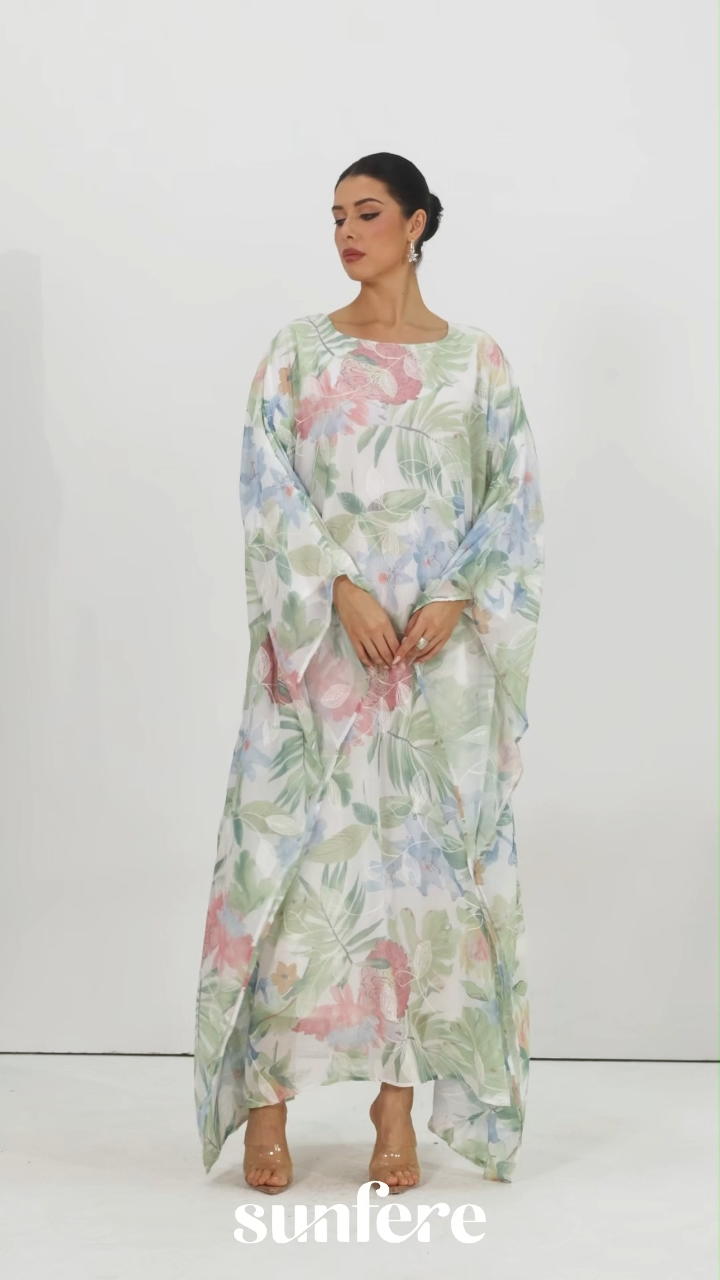 Runder Ausschnitt, Blumenmuster, weite Ärmel, fließende Silhouette, asymmetrischer Saum, Maxilänge.