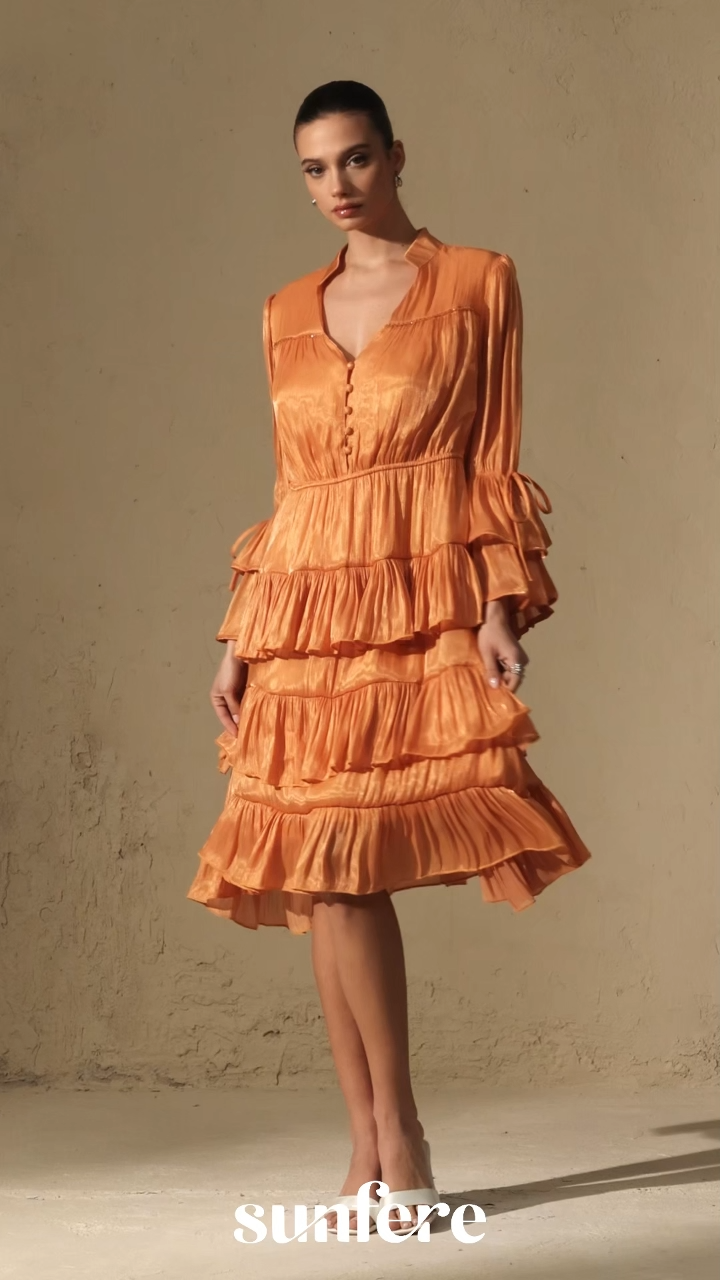 Keep It Interesting Orange V-Neck Tiered Ruffle Midi Dress