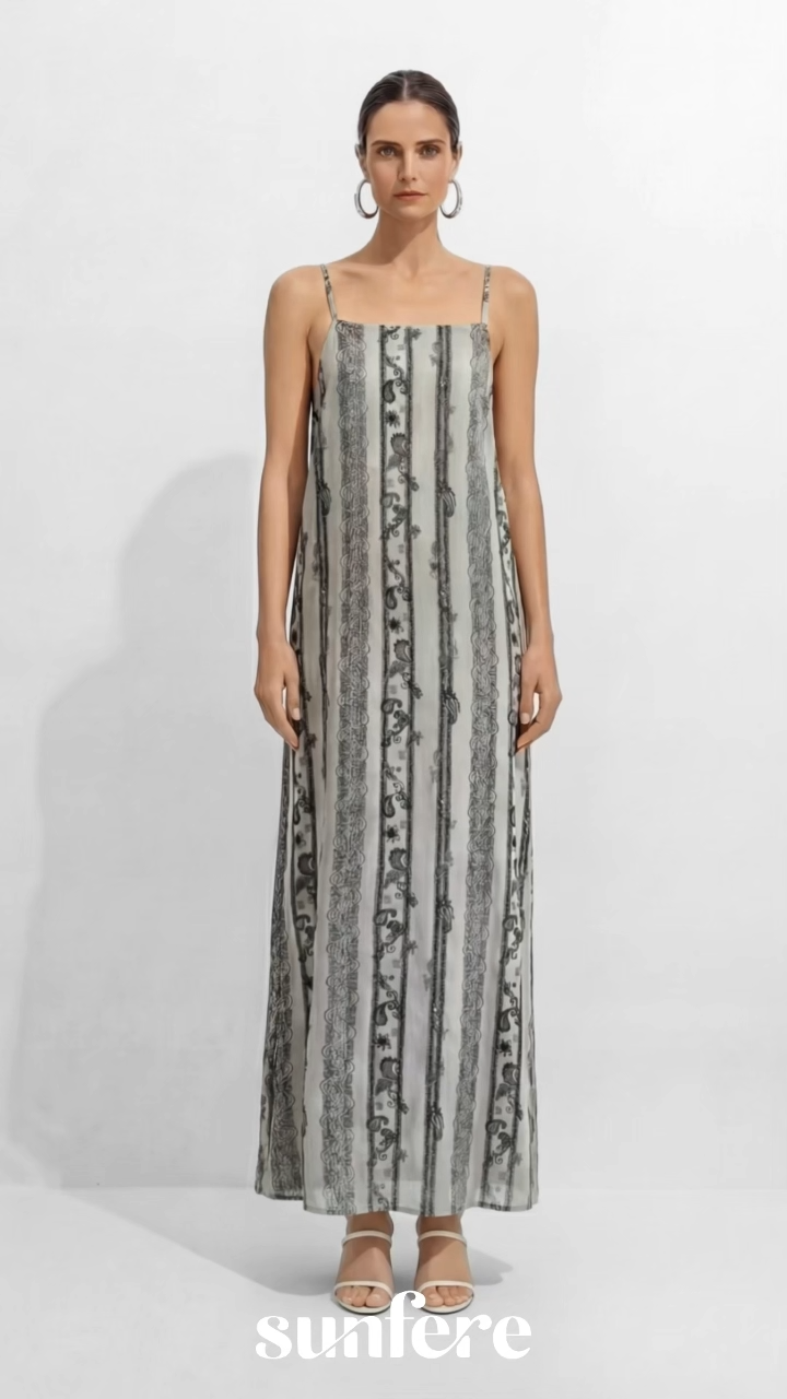 Perfect for warm-weather outings, this grey paisley-print maxi slip dress blends laid-back ease with a vintage-inspired pattern, making it ideal for brunch dates, weekend getaways and casual outings.