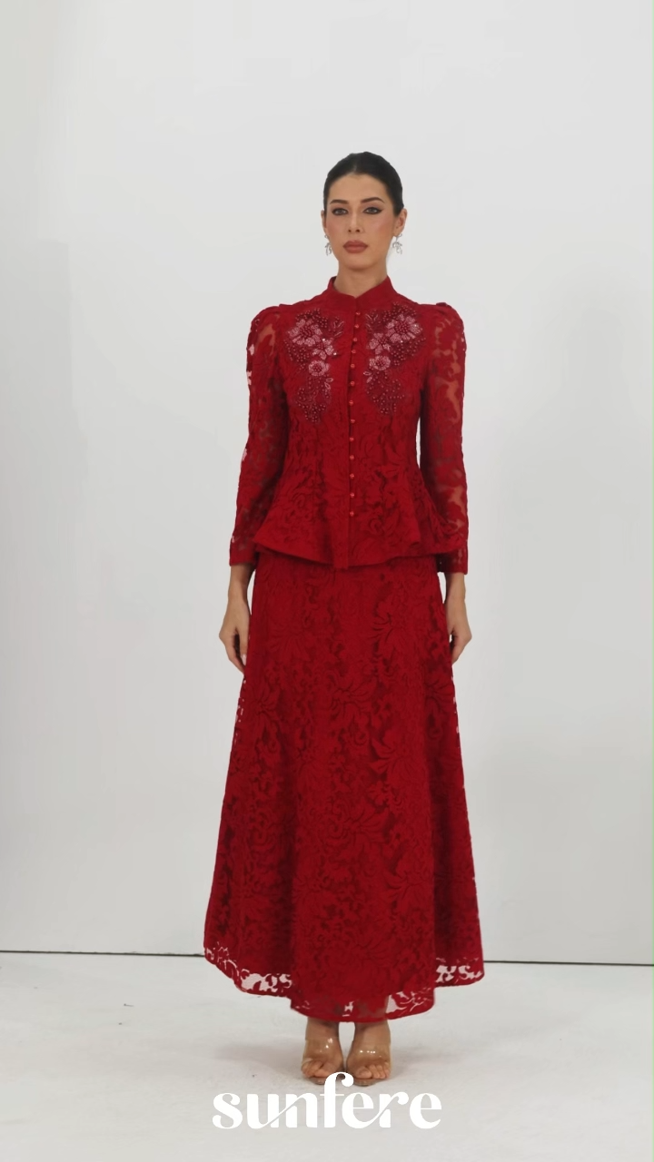 Ce élégant ensemble en dentelle rouge à deux pièces est parfait pour les mariages, les banquets formels et les occasions de célébration spéciales.