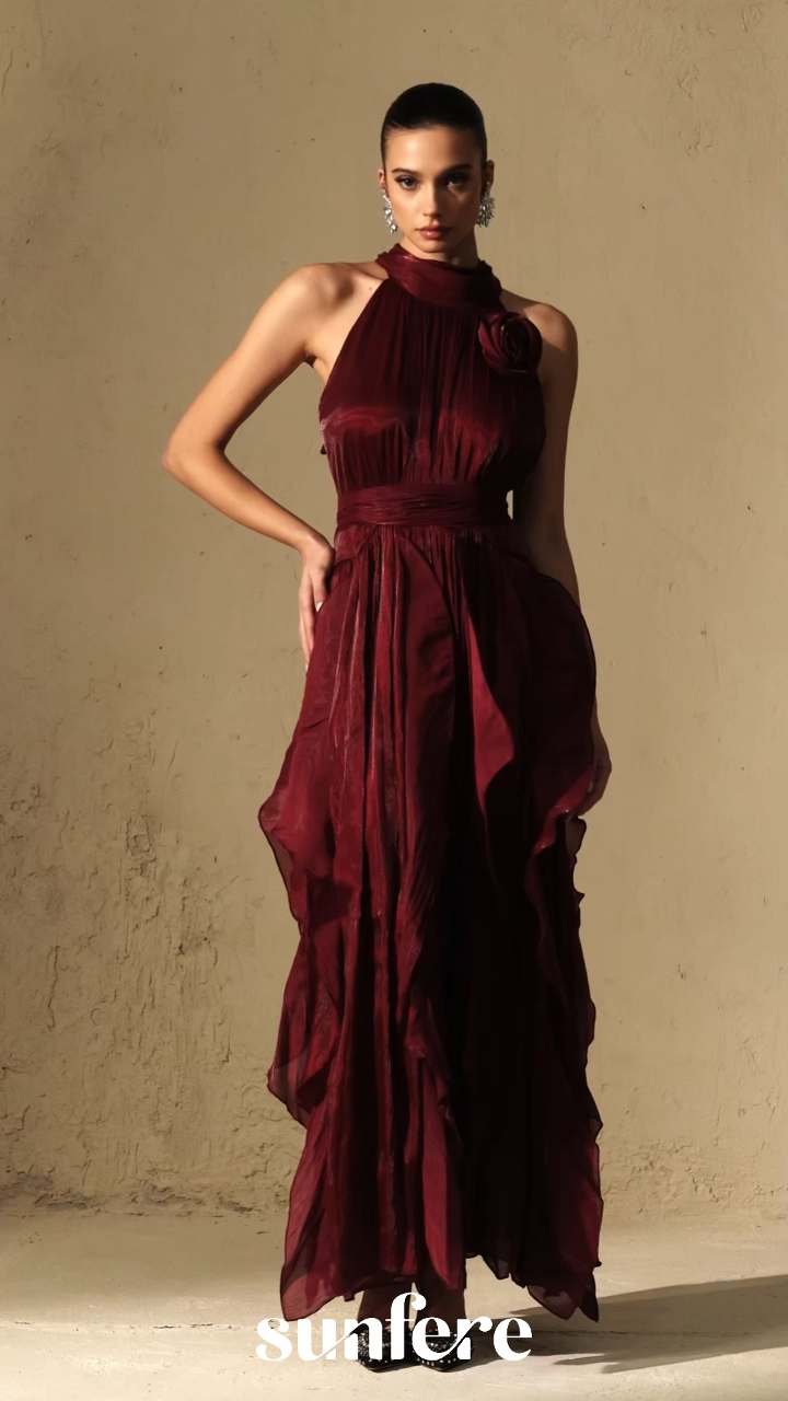 Sleeveless, Pleated Bodice, Rosette Detail, Tiered Ruffles, Bow Back, Belted Waist, Maxi Length