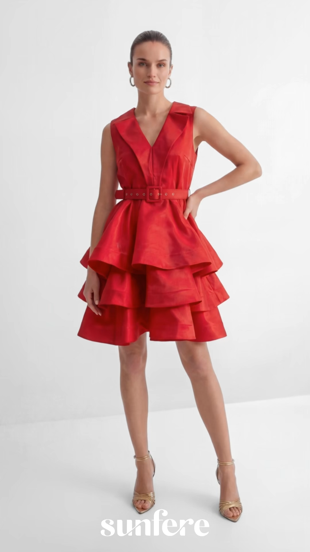 Design: notched V-neck, sleeveless design, structured bodice, tiered ruffled skirt, adjustable belted waist, shiny satin texture
