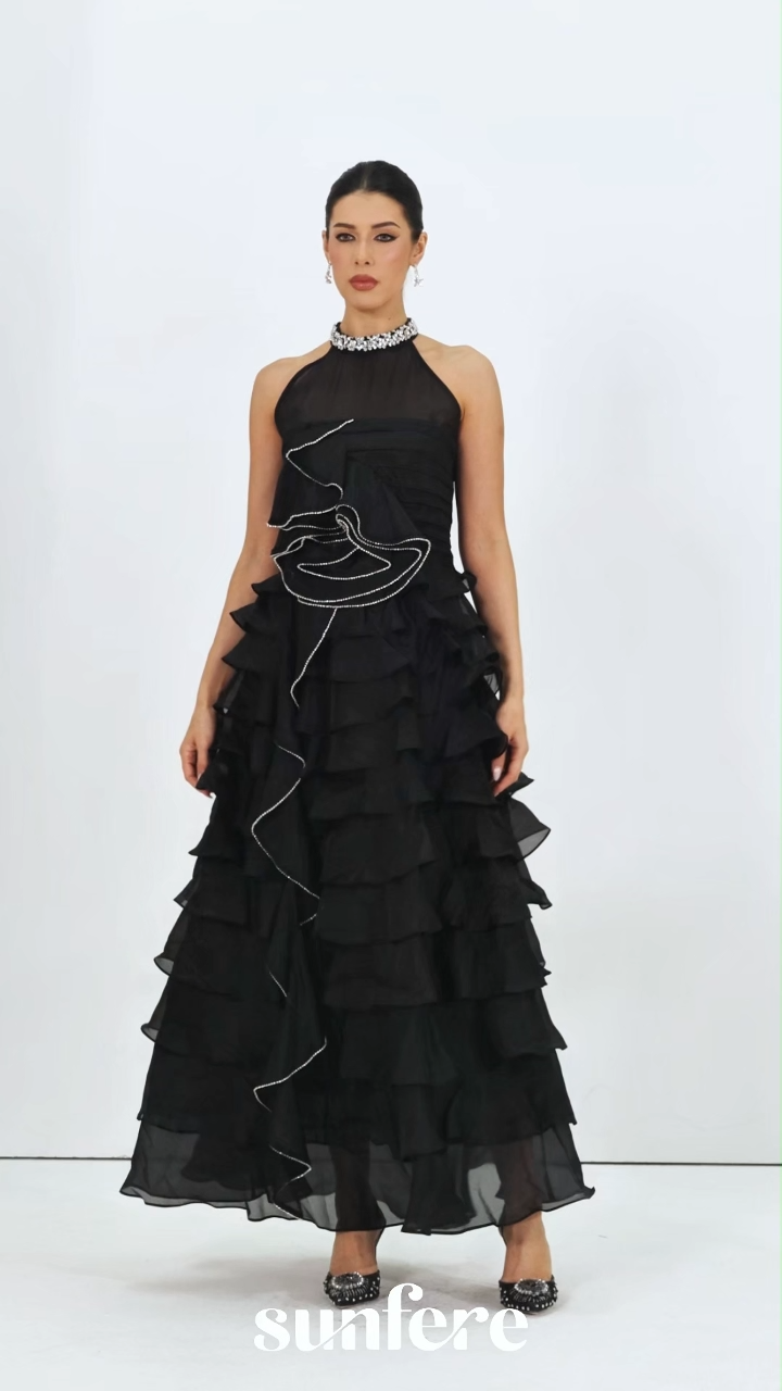 この魅力的な黒のハルタードレスは、ビーズのネックライン、 cascading ruffle layers、ビーズのアクセントが特徴で、夜のガラ、レッドカーペットイベント、フォーマルパーティーに最適で、大胆な洗練さを披露します。