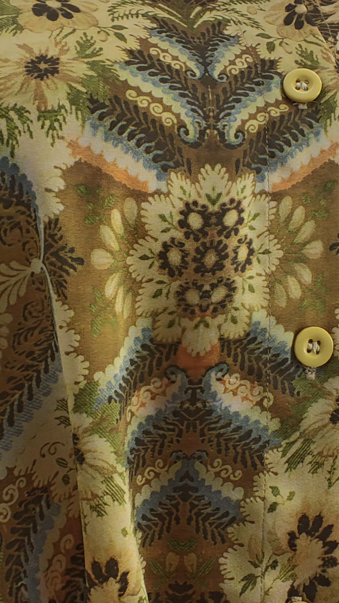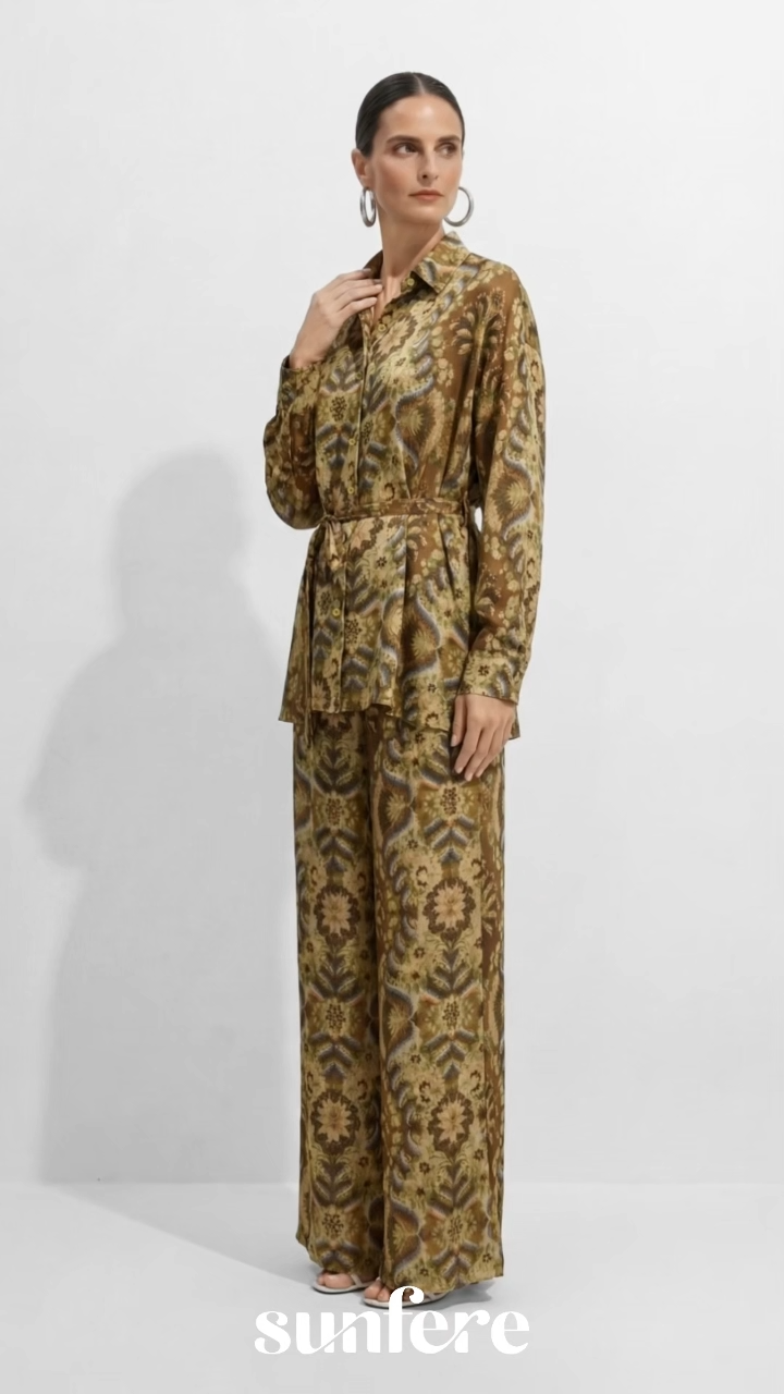 This elegant brown vintage print satin set, with a collared shirt and wide-leg trousers, is perfect for casual outings, brunch dates and office occasions, exuding timeless retro charm.