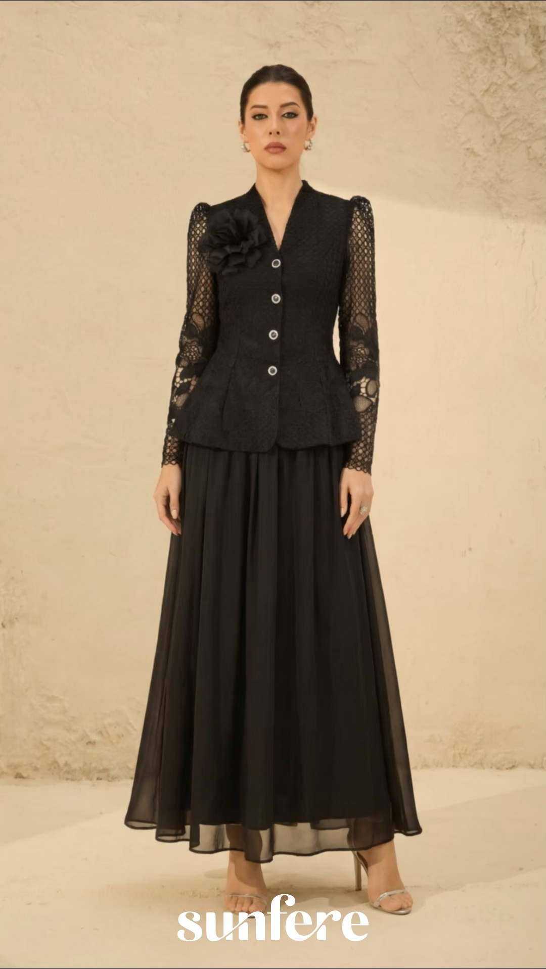 Malam Keanggunan Set Atasan Lengan Lutsinar Bordir Bunga Hitam & Skirt