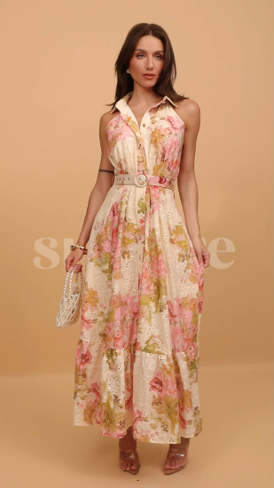 Reka Bentuk: Cetakan Bunga, Kolar Baju, Pinggang Berikat, Tanpa Lengan, Panjang Midi.