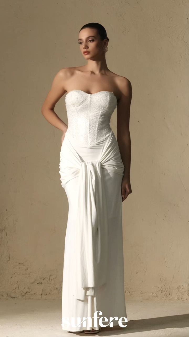 Strapless Neckline, Corset Bodice, Sequin Detail, Draped Knot Waist Detail, Maxi Length.
