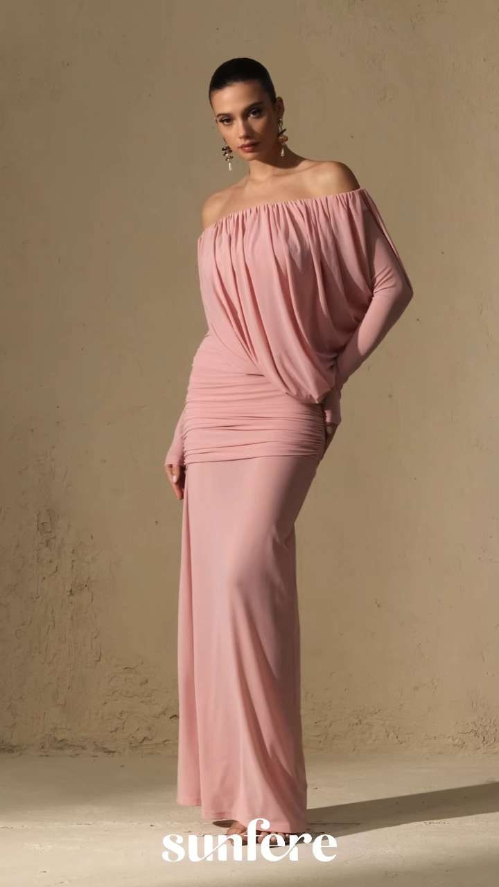 Off-shoulder Design, Draped Bodice, Ruched Waist Detail, Maxi Length.
