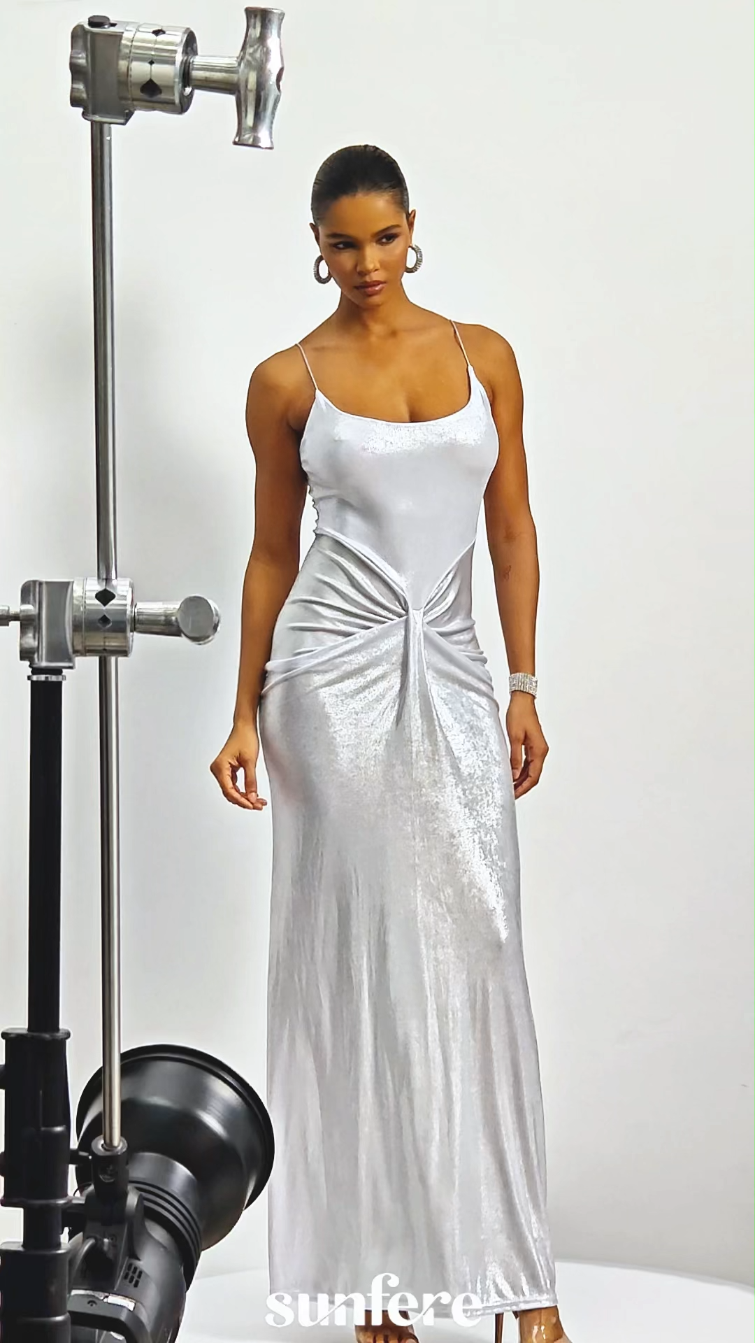 Shine effortlessly in this casual maxi dress designed for comfort and glam. The Eve Metallic Spaghetti Strap Maxi Dress features a ruched waist, flattering fit, and high-stretch metallic jersey—perfect for parties, vacations, or weekend style. Loved by trendsetters and busy women alike, it's your go-to for elevated ease. True to size and ultra wearable.