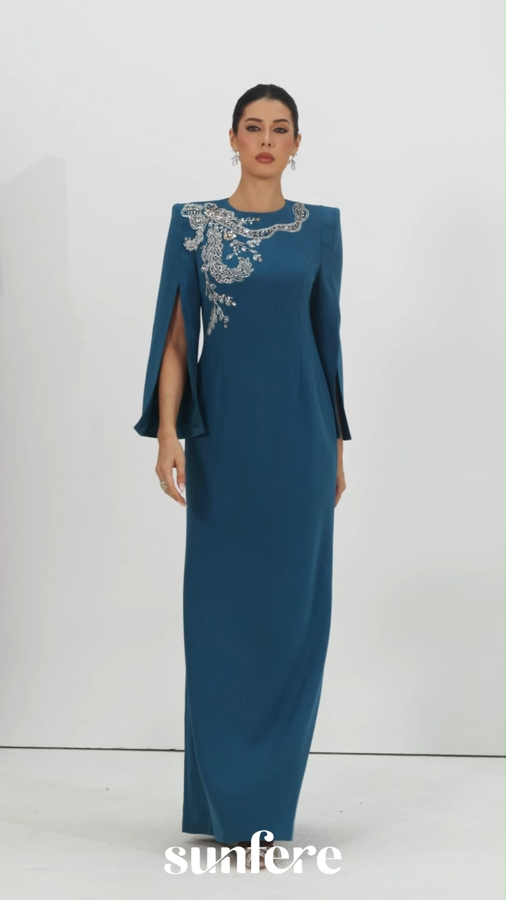 This glamorous teal maxi dress, with intricate beaded embroidery and split cape sleeves, is perfect for formal galas, wedding events, and special occasions, radiating luxurious sophisticated charm.