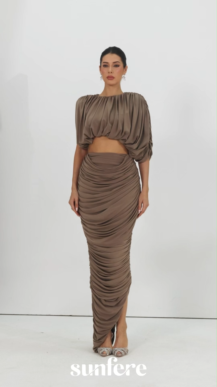 This sophisticated two-piece set, with a draped cropped top and ruched maxi skirt, is perfect for cocktail parties, formal dinners, and special occasions, radiating modern elegant charm.