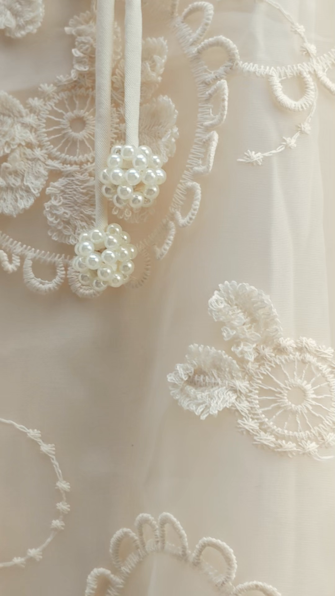 This dreamy beige floral lace maxi dress, with a self-tie waist belt and spaghetti straps, is perfect for garden weddings, bridal showers, and spring events, radiating romantic vintage charm.