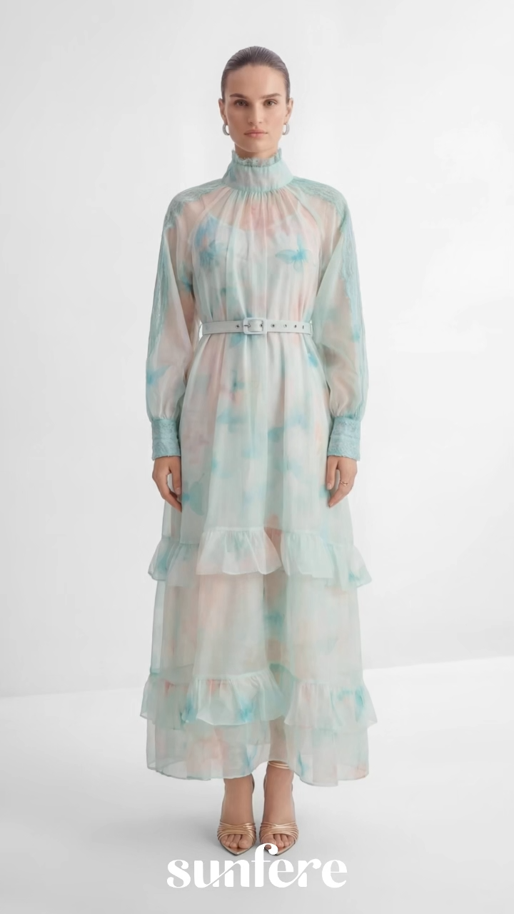 Design: ruffled high neck, long puff sleeves with lace trim, self-tie belted waist, tiered ruffle skirt, sheer butterfly print texture
