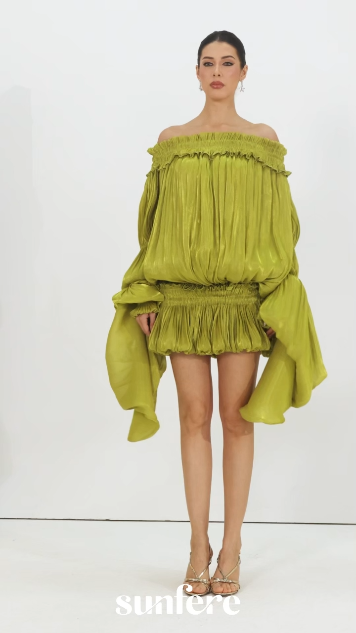 This bold off-shoulder mini dress, with voluminous pleated sleeves and a shirred hem, is perfect for summer festivals, beach parties, and bold fashion outings, radiating playful bohemian energy.
